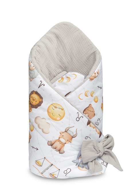 Jednostronny rożek niemowlęcy Muślin został stworzony z myślą o noworodkach i niemowlętach. Zapięcie na rzep umożliwia wygodne trzymanie dziecka podczas karmienia i usypiania. Po rozłożeniu, rożek może być z powodzeniem stosowany jako kołderka do łóżeczka czy wózka dziecięcego. Może także służyć jako mata do zabawy. Wykonany został z tkanin bawełnianych: bawełny drukowanej oraz muślinu. Wypełnienie rożka to antyalergiczna włóknina puszysta silikonowa. Wysoką jakość wykonania podkreśla estetyczna wypustka