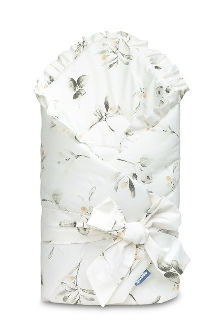 Dwustronny rożek niemowlęcy z falbanką został stworzony z myślą o noworodkach i niemowlętach. Wiązane zapięcie z szeroką bawełnianą tasiemką umożliwia wygodne trzymanie dziecka podczas karmienia i usypiania. Po rozłożeniu, rożek może być z powodzeniem stosowany jako kołderka do łóżeczka czy wózka dziecięcego. Może także służyć jako mata do zabawy. Wykonany został z bawełny 100%. Wypełnienie rożka to włóknina puszysta silikonowa. Wykończenie stanowi gustowna falbanka.